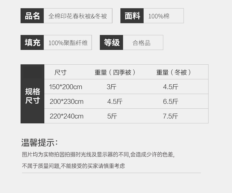 100%全棉面料 整张羽丝棉填充 商品净重2.25kg